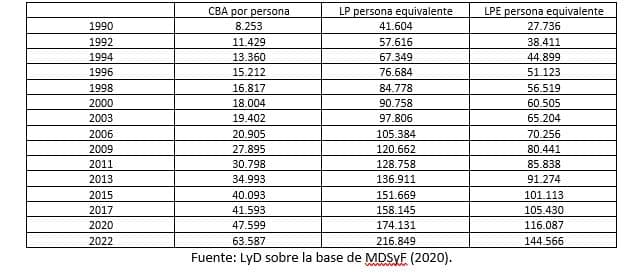Cuadro 2. Valor de la CBA por persona, LP persona equivalente y LPE persona equivalente, 1990-2022 ($ de noviembre de cada año)