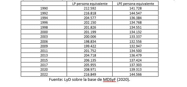Cuadro 3. LP persona equivalente y LPE persona equivalente, 1990-2020 ($ de noviembre 2022)