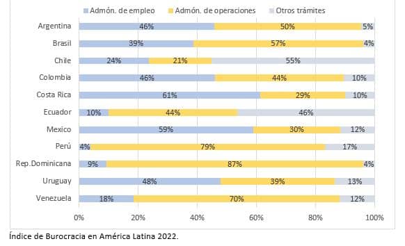En contraparte, en el país la mayor carga se concentra en “otros trámites burocráticos” (55% del total de las horas/año exigidas), seguido por Ecuador 46% del total).