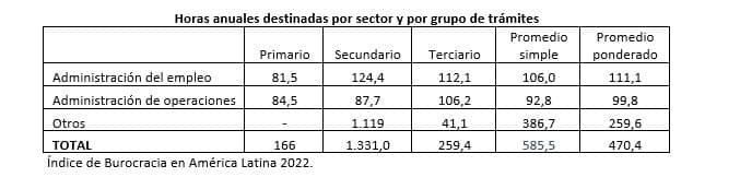 El análisis por sectores económicos revela que, en promedio, el sector primario destina 544 h/año al cumplimiento de trámites burocráticos, el sector secundario 703 h/año y el sector terciario 509 h/año.