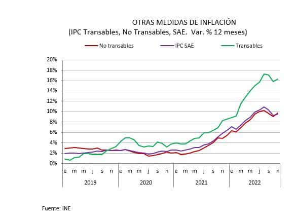 El índice de precios de los transables y el de no transables, que habían logrado una moderación de su incremento anual en octubre, volvieron a aumentar, situándose en 16,3% y 9,7%, respectivamente. Lo mismo ocurre con el IPC sin alimentos, ni energía (IPCSAE) que registró una variación mensual de 0,7%, alcanzando una variación anual de 9,5%, mayor a la registrada en octubre (9,3%). Este resultado llevará a que la unidad de fomento se incrementará en $347 en los próximos días.