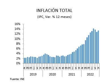 El Instituto Nacional de Estadísticas (INE) dio a conocer el Índice de Precios al Consumidor (IPC) para el mes de noviembre de 2022, el cual registró una variación mensual de 1%, muy por sobre lo esperado por el mercado, acumulando 12,5% en lo que va del año. En doce meses, la inflación total alcanzó una variación de 13,3%, aumentando con respecto al registro de octubre.