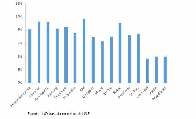 En este trimestre pudimos ver un aumento del desempleo en 9 regiones y una reducción en 5, mientras que en dos regiones se mantuvo. La Región Metropolitana -la cual concentra el 45% de la fuerza laboral-, lidera la tasa de desempleo con un registro de 9,7%. En contraste, la región con menor tasa de desempleo fue Los Lagos (3,7%) y Aysén y Magallanes, ambas con una tasa de 4%.