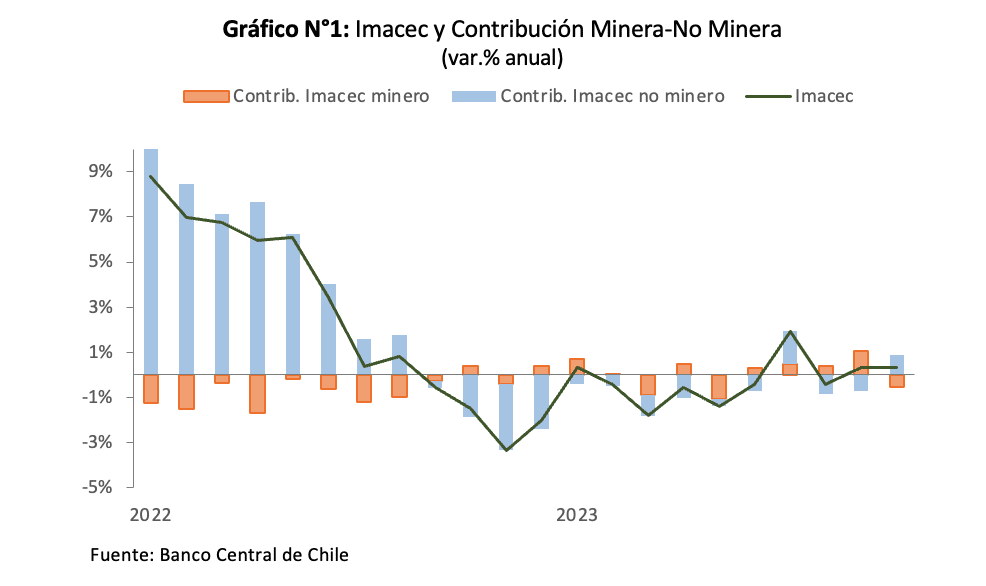 Si desagregamos el Imacec entre minero y no minero, se tiene que el primero cayó 4%, incidiendo negativamente en la variación anual del Imacec, mientras que la actividad no minera creció 1%, compensando en parte la contracción de la minería.
