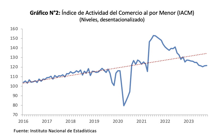 Por su parte, el comercio no ha logrado repuntar este año y sigue bajo la tendencia pre pandemia como se puede notar en el Gráfico N°2. En octubre, el Índice de Actividad del Comercio (IAC) y el Índice de Actividad del Comercio al por Menor (IACM) disminuyeron 0,9% y 6,9% respectivamente, completándose 18 meses de caídas consecutivas en ambos casos. En el último, continúa destacando las bajas en ventas de vestuario y calzado.