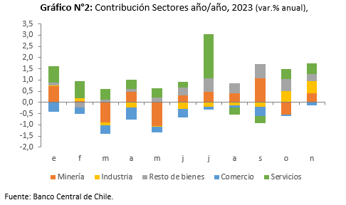 Con todo, los últimos datos de imacec han estado ligados mayormente a factores puntuales, por lo que aún no existen señales de recuperación de la actividad económica, salvo el efecto de la baja base de comparación de fines del año pasado. Cabe destacar que en noviembre de 2022, la caída fue de 3,3%, por lo que el resultado actual no logra compensar la contracción que la economía chilena experimentó hace un año atrás.