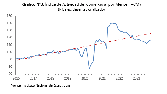 Por su parte, el comercio no ha logrado repuntar este año y sigue bajo la tendencia pre pandemia como se puede notar en el Gráfico N°3. En noviembre, el Índice de Actividad del Comercio (IAC) y el Índice de Actividad del Comercio al por Menor (IACM) disminuyeron 0,8% y 2,4% respectivamente, completándose 19 meses de caídas consecutivas en ambos casos. En el último, continúa destacando las bajas en ventas de vestuario y calzado.
