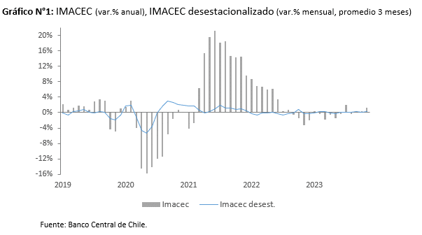 El Banco Central de Chile dio a conocer el Imacec de noviembre de 2023, el cual aumentó 1,2% con respecto al mismo mes del año anterior, en torno a lo esperado por el mercado. En esta ocasión y a excepción del comercio, todos los sectores incidieron positivamente en el resultado. La serie desestacionalizada, por su parte, aumentó 0,3% con respecto al mes previo.