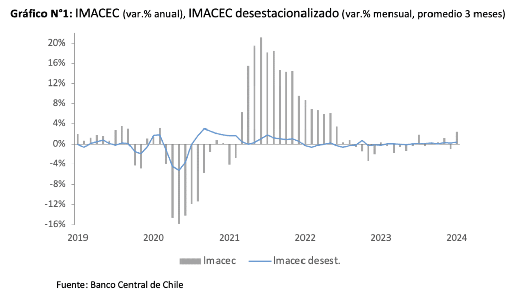 El Banco Central de Chile dio a conocer el Imacec de enero de 2024, el cual aumentó 2,5% en comparación al mismo mes del año anterior, por sobre lo esperado por el mercado y con aportes positivos de todos los sectores. La serie desestacionalizada, por su parte, creció 1,7% con respecto al mes previo, impulsado principalmente por la minería.