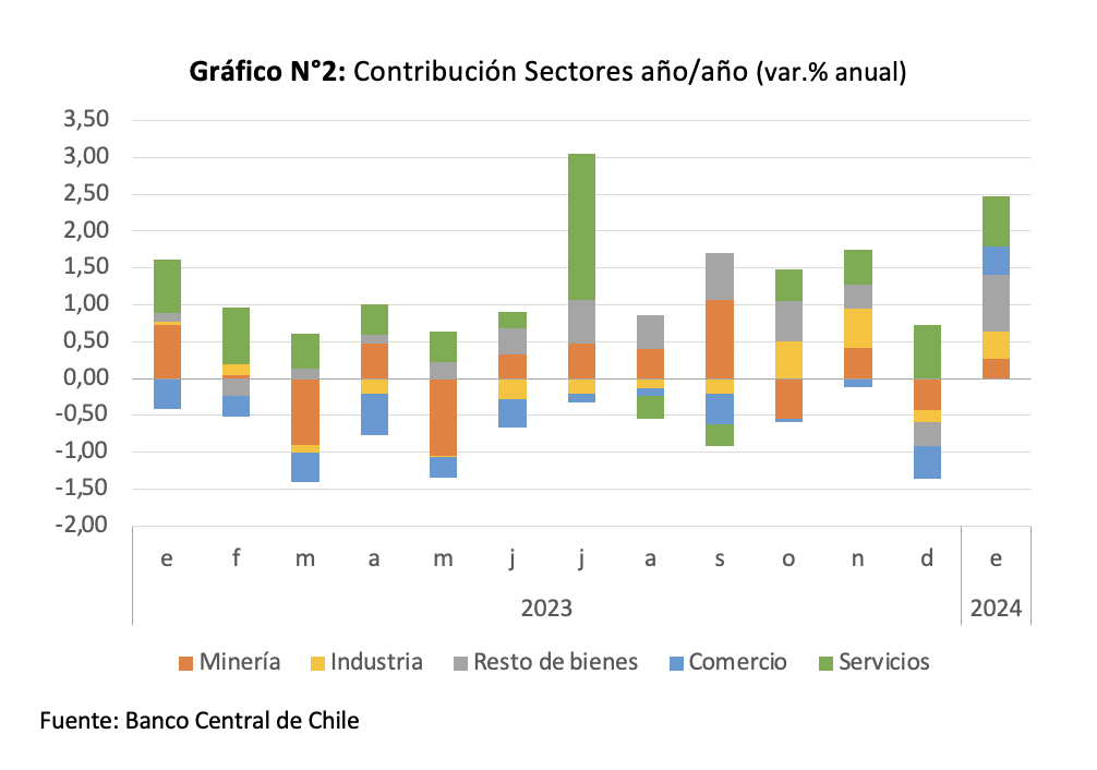 En terminos anuales, destacó el desempeño de resto de bienes y servicios, que crecieron 5,2% y 1,9%, respectivamente, debido a un mayor valor agregado de la generación eléctrica en el caso del primero, y a los servicios personales y transporte en el segundo. Adicionalmente, el comercio, luego de 20 meses consecutivos en terreno negativo logró repuntar con un alza de 3,7% en el primer mes del año. Por último, la industria y la minería aumentaron 3,6% y 1,9%, respectivamente, de la mano de los datos sectoriales del INE publicados el día de ayer.