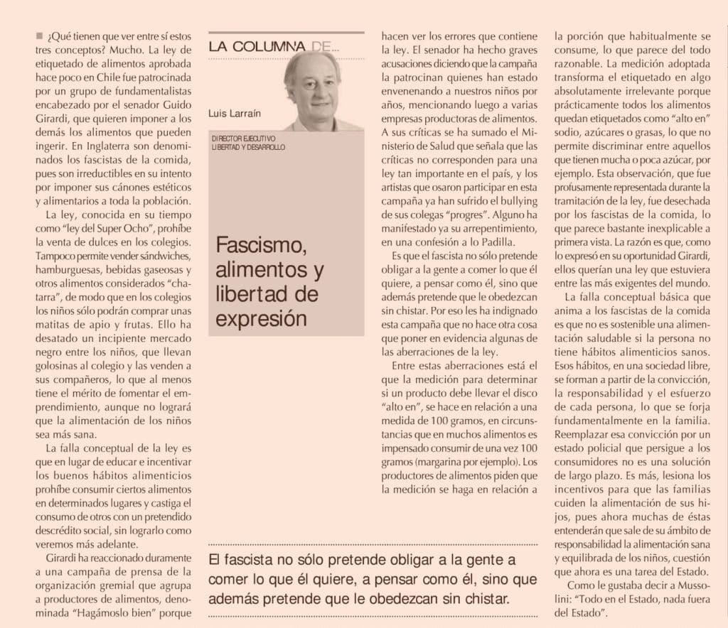 ¿Qué tienen que ver entre sí los tres conceptos anteriores? Mucho. La ley de etiquetado de alimentos aprobada hace poco en Chile fue patrocinada por un grupo de fundamentalistas encabezado por el Senador Guido Girardi, que quieren imponer a los demás los alimentos que pueden ingerir. En Inglaterra son denominados los fascistas de la comida, pues son irreductibles en su intento por imponer sus cánones estéticos y alimentarios a toda la población.