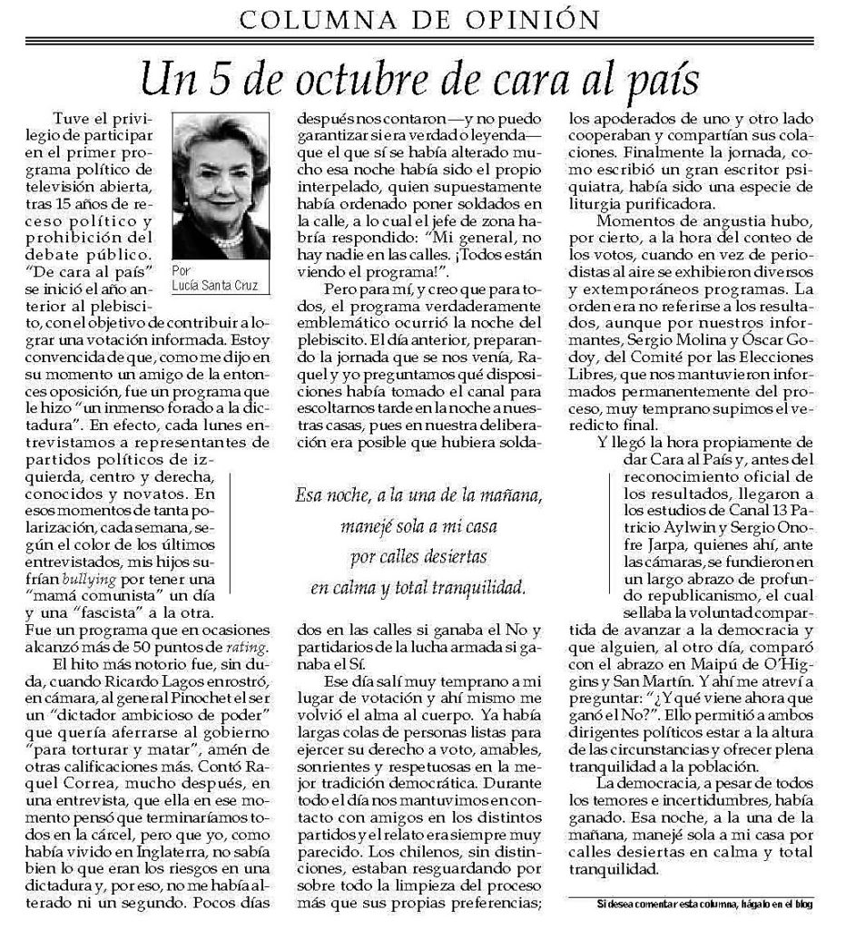 Columna de Lucía Santa Cruz, Consejera de Libertad y Desarrollo, publicada en El Mercurio.-