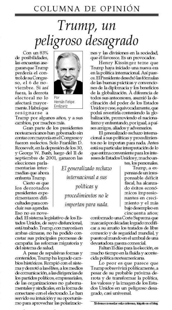 Con un 83% de posibilidades, las encuestas aseguran que Trump perdería el control de su Congreso, el 6 de noviembre. Si así fuera, la derrota electoral no lo afectará mayormente. Habrá que resignarse a Trump por algunos años, y a sus cambios, por muchos más.