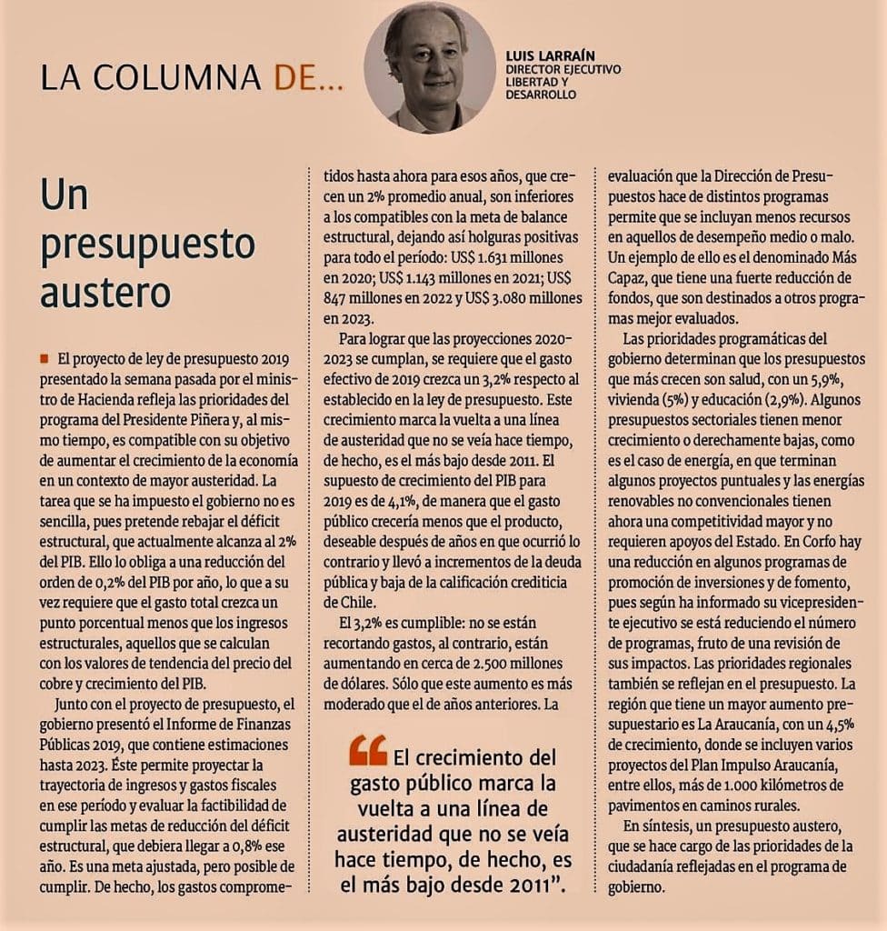 El proyecto de ley de presupuestos 2019 presentado la semana pasada por el Ministro de Hacienda refleja las prioridades del programa de gobierno del Presidente Piñera y al mismo tiempo es compatible con su objetivo de aumentar el crecimiento de la economía en un contexto de mayor austeridad. La tarea que se ha impuesto el gobierno no es sencilla, pues pretende rebajar el déficit estructural que actualmente alcanza al 2% del PIB. Ello lo obliga a una reducción del orden de 0,2% del PIB por año, lo que a su vez requiere que el gasto total crezca un punto porcentual menos que los ingresos estructurales, aquellos que se calculan con los valores de tendencia del precio del cobre y crecimiento del PIB.