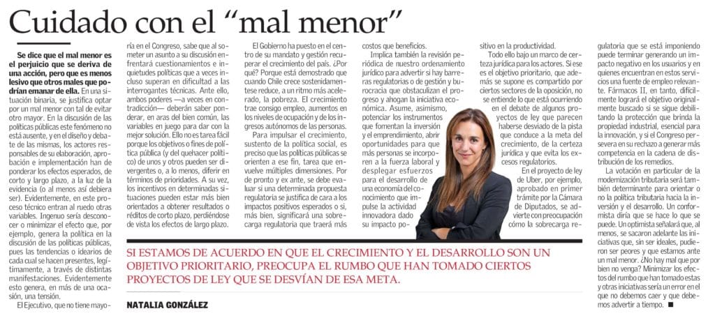 El Gobierno ha puesto en el centro de su mandato y gestión recuperar el crecimiento del país. ¿Por qué? Porque está demostrado que cuando Chile crece sostenidamente se reduce, a un ritmo más acelerado, la pobreza. El crecimiento trae consigo empleo, aumentos en los niveles de ocupación y de los ingresos autónomos de las personas. Para impulsar el crecimiento, sustento de la política social, es preciso que las políticas públicas se orienten a ese fin, tarea que envuelve múltiples dimensiones. Por de pronto y ex ante, se debe evaluar si una determinada propuesta regulatoria se justifica de cara a los impactos positivos esperados o si, más bien, significará una sobre carga regulatoria que traerá más costos que beneficios. Implica también la revisión periódica de nuestro ordenamiento jurídico para advertir si hay barreras regulatorias o de gestión y burocracia que obstaculizan el progreso y ahogan la iniciativa económica. Asume, asimismo, potenciar los instrumentos que fomentan la inversión y el emprendimiento, abrir oportunidades para que más personas se incorporen a la fuerza laboral y desplegar esfuerzos para el desarrollo de una economía del conocimiento que impulse la actividad innovadora dado su impacto positivo en la productividad. Todo ello, bajo un marco de certeza jurídica para los actores. Si ese es el objetivo prioritario, que además se supone es compartido por ciertos sectores de la oposición, no se entiende lo que está ocurriendo en el debate de algunos proyectos de ley que parecen haberse desviado de la pista que conduce a la meta del crecimiento, de la certeza jurídica y que evita los excesos regulatorios. En el proyecto de ley de Uber, por ejemplo, aprobado en primer trámite por la Cámara de Diputados, se advierte con preocupación cómo la sobre carga regulatoria que se está imponiendo puede terminar generando un impacto negativo en los usuarios y en quienes encuentran en estos servicios una fuente de empleo relevante. Fármacos II, en tanto, difícilmente logrará el objetivo originalmente buscado si se sigue debilitando la protección que brinda la propiedad industrial, esencial para la innovación, y si el Congreso persevera en su rechazo a generar más competencia en la cadena de distribución de los remedios. La votación en particular de la modernización tributaria será también determinante para orientar o no la política tributaria hacia la inversión y el desarrollo. Un conformista diría que se hace lo que se puede. Un optimista señalará que, al menos, se sacaron adelante las iniciativas que, sin ser ideales, pudieron ser peores y que estamos ante un mal menor. ¿No hay mal que por bien no venga? Minimizar los efectos del rumbo que han tomado éstas y otras iniciativas sería un error en el que no debemos caer y que debemos advertir a tiempo.