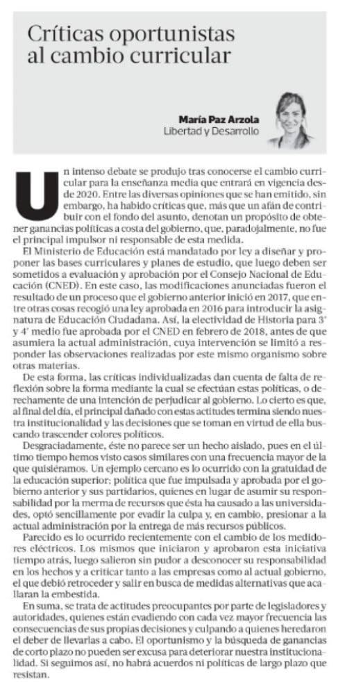 Un intenso debate se produjo tras conocerse el cambio curricular para la enseñanza media que entrará en vigencia desde 2020. Entre las diversas opiniones que se han emitido, sin embargo, ha habido críticas que, más que un afán de contribuir con el fondo del asunto, denotan un propósito de obtener ganancias políticas a costa del gobierno, que, paradojalmente, no fue el principal impulsor ni responsable de esta medida.