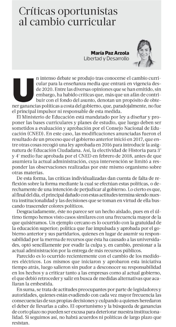 Columna de María Paz Arzola, Coordinadora del Programa Social de Libertad y Desarrollo, publicada en La Tercera.-