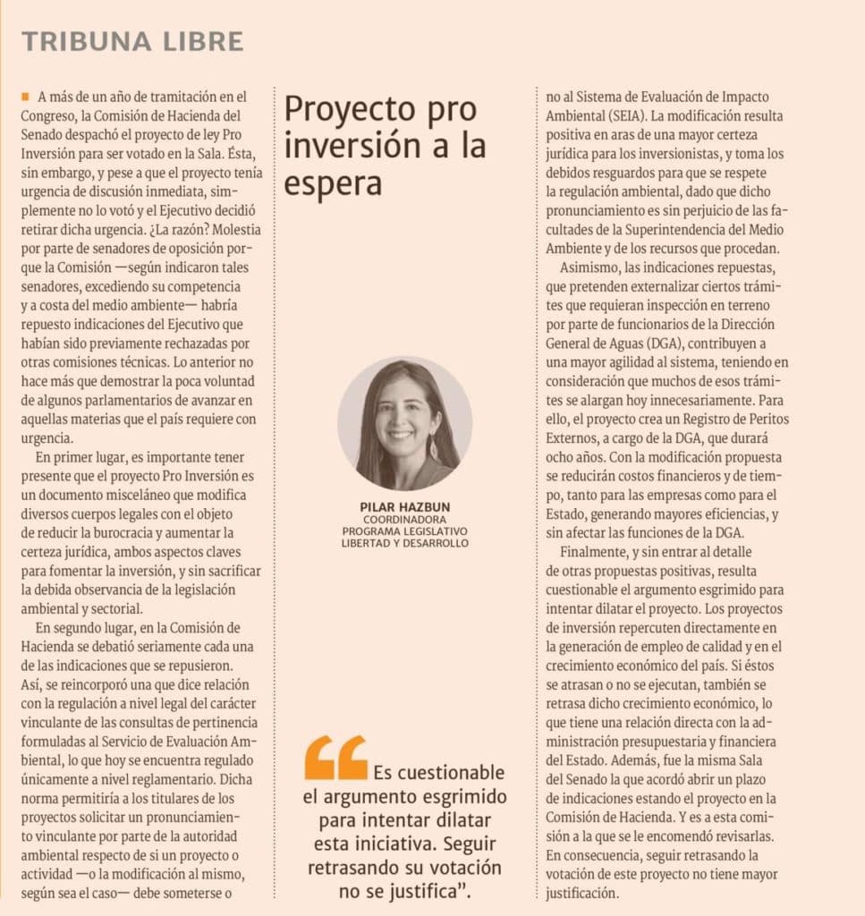Columna de Pilar Hazbún, Coordinadora Programa legislativo de Libertad y Desarrollo, publicada en El Diario Financiero.-