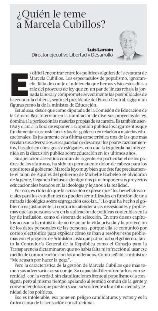 Es difícil encontrar entre los políticos alguien de la estatura de Marcela Cubillos. Los espectáculos de populismo, ignorancia, falta de coraje e indolencia que hemos visto estos días a raíz del proyecto de ley que en un par de líneas rebaja la jornada laboral y compromete severamente las posibilidades de la economía chilena, según el presidente del Banco Central, agigantan figuras como la de la ministra de Educación.