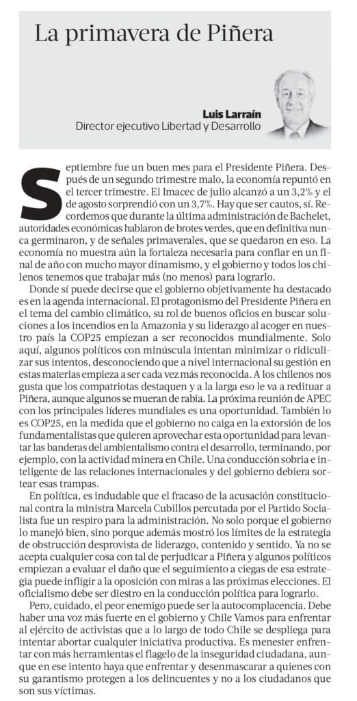 Septiembre fue un buen mes para el Presidente Piñera. Después de un segundo trimestre malo, la economía repuntó en el tercer trimestre. El IMACEC de julio alcanzó a un 3,2% y el de agosto sorprendió con un 3,7%. Hay que ser cautos sí. Recordemos que durante la última administración de Bachelet autoridades económicas hablaron de brotes verdes, que en definitiva nunca germinaron y de señales primaverales, que se quedaron en eso. La economía no muestra aún la fortaleza necesaria para confiar en un final de año con mucho mayor dinamismo, y el gobierno y todos los chilenos tenemos que trabajar más (no menos) para lograrlo.