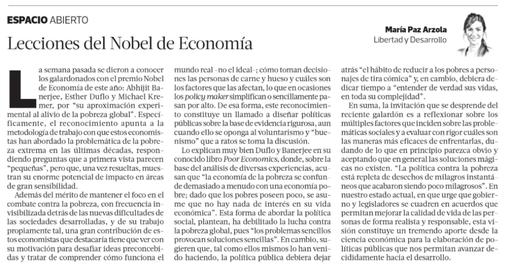 De esa forma, este reconocimiento constituye un llamado a diseñar políticas públicas sobre la base de evidencia rigurosa, aun cuando ello se oponga al voluntarismo y "buenismo" que a ratos se toma la discusión. Lo explican muy bien Duflo y Banerjee en su conocido libro Poor Economics, donde, sobre la base del análisis de diversas experiencias, acusan que "la economía de la pobreza se confunde demasiado a menudo con una economía pobre; dado que los pobres poseen poco, se asume que no hay nada de interés en su vida económica".