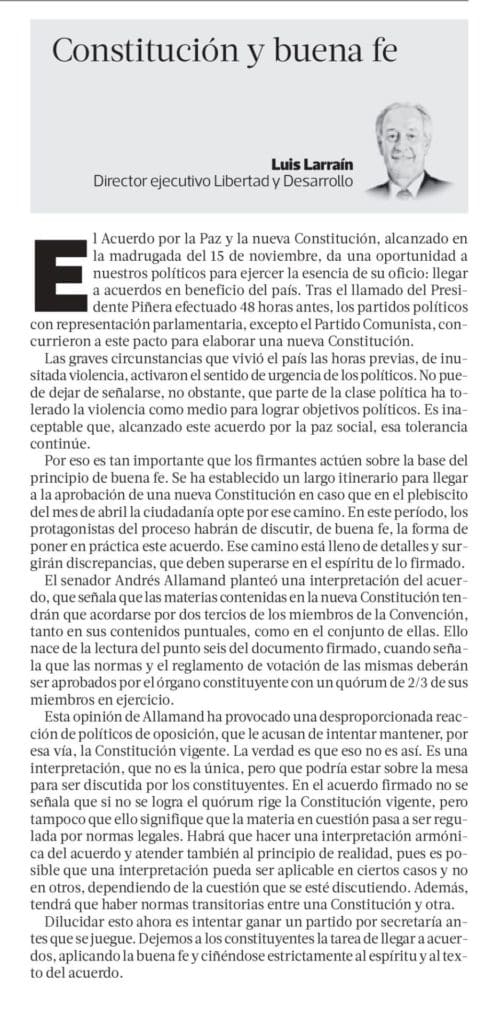 Por eso es tan importante que los firmantes actúen sobre la base del principio de buena fe. Se ha establecido un largo itinerario para llegar a la aprobación de una nueva constitución en caso que en el plebiscito del mes de abril la ciudadanía opte por ese camino. En este período, los protagonistas del proceso habrán de discutir, de buena fe, la forma de poner en práctica este acuerdo. Ese camino está lleno de detalles y surgirán discrepancias, que deben superarse en el espíritu de lo firmado.