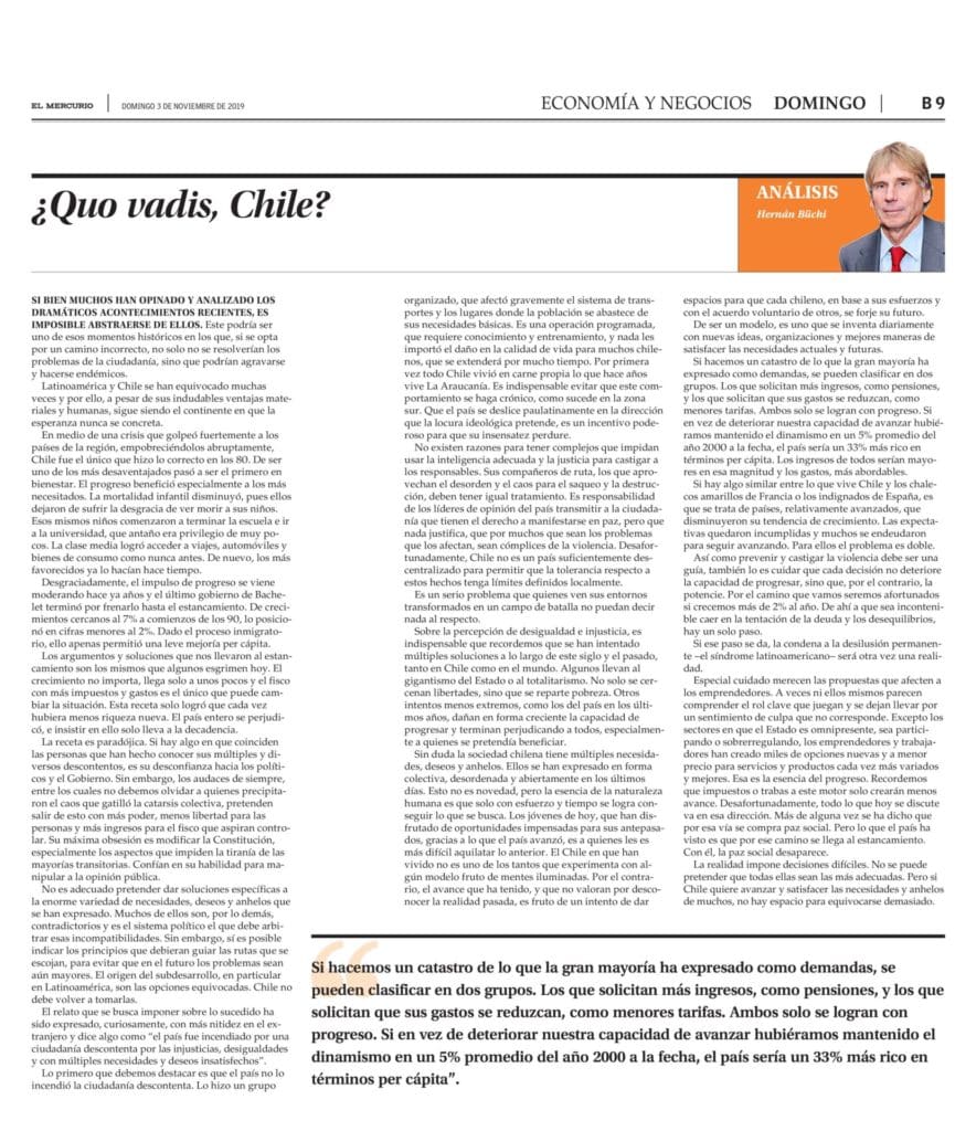 Columna de Hernán Büchi, Consejero de Libertad y Desarrollo, publicada en El Mercurio.-