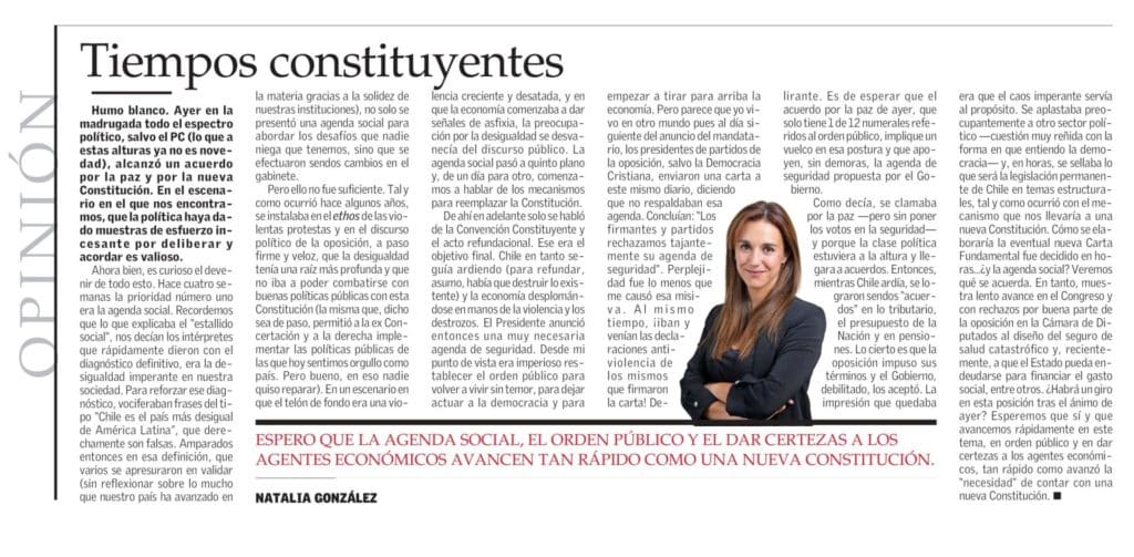 Como decía, se clamaba por la paz -pero sin poner los votos en la seguridad- y porque la clase política estuviera a la altura y llegara a acuerdos. Entonces, mientras Chile ardía, se lograron sendos “acuerdos” en lo tributario, el presupuesto de la Nación y en pensiones. Lo cierto es que la oposición impuso sus términos y el gobierno, debilitado, los aceptó. La impresión que quedaba era que el caos imperante servía el propósito. Se aplastaba preocupantemente a otro sector político -cuestión muy reñida con la forma que entiendo la democracia- y, en horas, se sellaba lo que será la legislación permanente de Chile en temas estructurales, tal y como ocurrió con el mecanismo que nos llevaría a una nueva Constitución. Como se elaboraría la eventual nueva Carta Fundamental fue decidido en horas… ¿Y la agenda social? Veremos qué se acuerda. En tanto, muestra lento avance en el Congreso y con rechazos por buena parte de la oposición en la Cámara de Diputados al diseño del seguro de salud catastrófico y, recientemente, a que el Estado pueda endeudarse para financiar el gasto social, entre otros. ¿Habrá un giro en esta posición tras el ánimo de ayer? Esperemos que sí y que avancemos rápidamente en este tema, en orden público y en dar certezas a los agentes económicos, tan rápido como avanzó la “necesidad” de contar con una nueva Constitución.