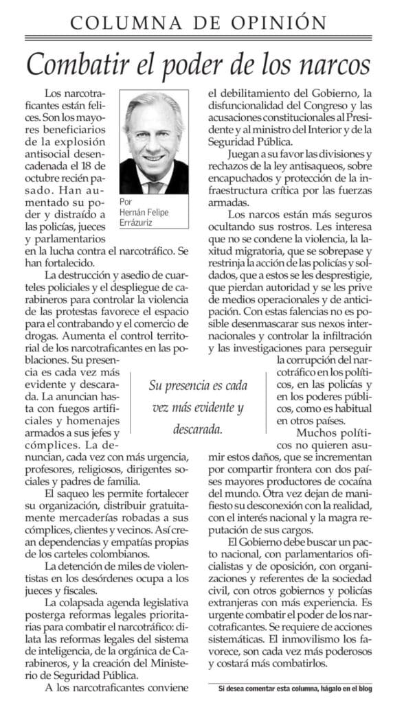 Los narcotraficantes están felices. Son los mayores beneficiarios de la explosión antisocial desencadenada el 18 de octubre recién pasado. Han aumentado su poder y distraído a las policías, jueces y parlamentarios en la lucha contra el narcotráfico. Se han fortalecido. La destrucción y asedio de cuarteles policiales y el despliegue de carabineros para controlar la violencia de las protestas favorece el espacio para el contrabando y el comercio de drogas. Aumenta el control territorial de los narcotraficantes en las poblaciones. Su presencia es cada vez más evidente y descarada. La anuncian hasta con fuegos artificiales y homenajes armados a sus jefes y cómplices. La denuncian, cada vez con más urgencia, profesores, religiosos, dirigentes sociales y padres de familia. El saqueo les permite fortalecer su organización, distribuir gratuitamente mercaderías robadas a sus cómplices, clientes y vecinos. Así crean dependencias y empatías propias de los carteles colombianos. La detención de miles de violentistas en los desórdenes ocupa a los jueces y fiscales.