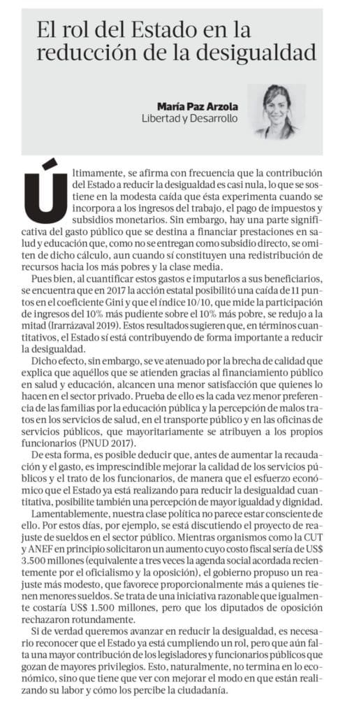 Columna de María Paz Arzola, Coordinadora del Programa Social de Libertad y Desarrollo, publicada en La Tercera.-