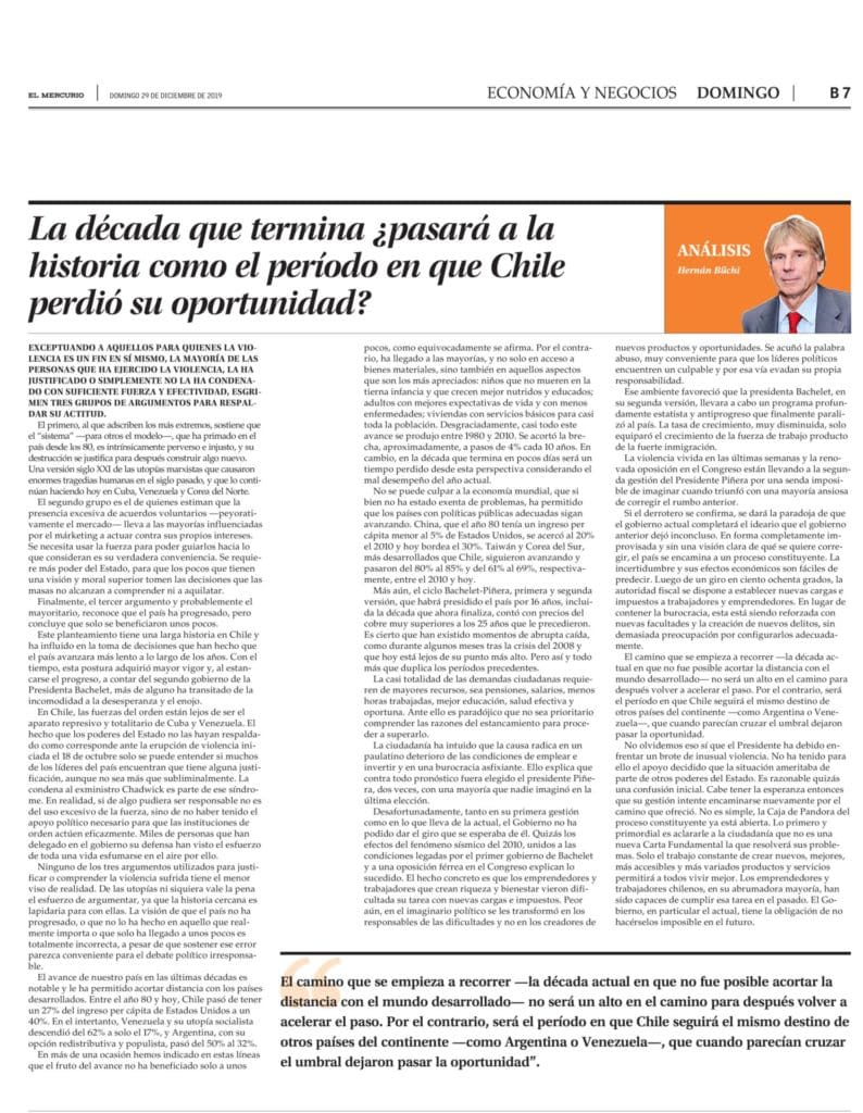 Columna de Hernán Büchi, Consejero de Libertad y Desarrollo, publicada en El Mercurio.-