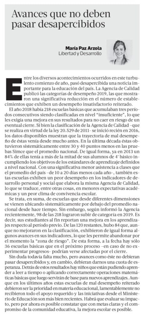 Entre los diversos acontecimientos ocurridos en este turbulento comienzo de año, pasó desapercibida una noticia importante para la educación del país. La Agencia de Calidad publicó las categorías de desempeño 2019, las que mostraron una significativa reducción en el número de establecimientos que exhiben un desempeño insatisfactorio reiterado.