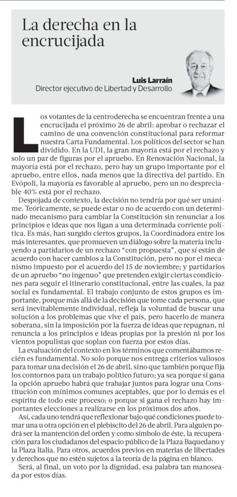 Los votantes de la centroderecha se encuentran frente a una encrucijada el próximo 26 de abril: aprobar o rechazar el camino de una convención constitucional para reformar nuestra carta fundamental. Los políticos del sector se han dividido. En la UDI la gran mayoría está por el Rechazo y sólo un par de figuras por el Apruebo. En Renovación Nacional la mayoría está por el Rechazo, pero hay un grupo importante por el Apruebo, entre ellos nada menos que la directiva del partido. En Evópoli la mayoría es favorable al Apruebo, pero un no despreciable 40% está por el rechazo.