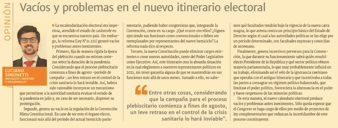 De esta manera, el nuevo calendario electoral produce vacíos y problemas antes inexistentes. Sólo queda esperar que el Congreso se haga cargo de ellos por medio de proyectos de ley complementarios que reduzcan la incertidumbre de este proceso constituyente.