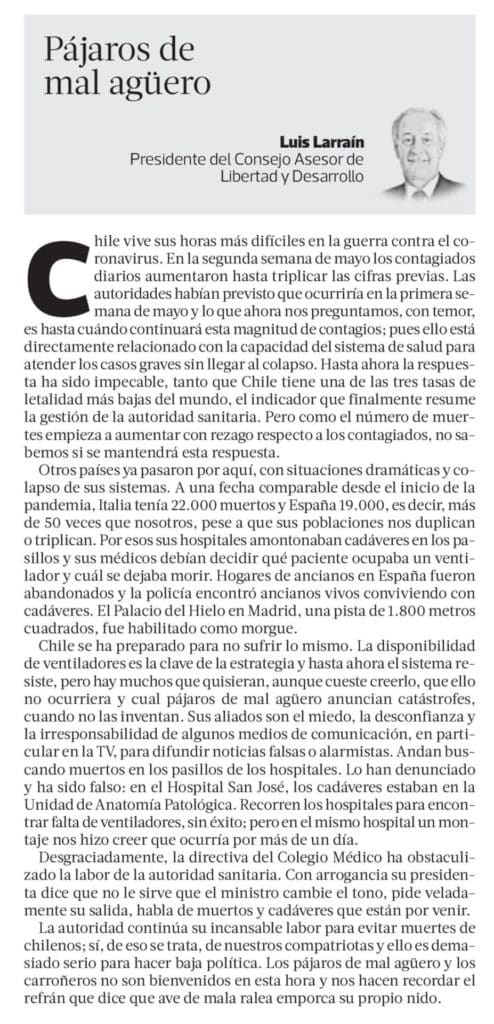 Chile se ha preparado para no sufrir lo mismo. La disponibilidad de ventiladores es la clave de la estrategia y hasta ahora el sistema resiste, pero hay muchos que quisieran, aunque cueste creerlo, que ello no ocurriera y cual pájaros de mal agüero anuncian catástrofes, cuando no las inventan. Sus aliados son el miedo, la desconfianza y la irresponsabilidad de algunos medios de comunicación, en particular en la TV, para difundir noticias falsas o alarmistas. Andan buscando muertos en los pasillos de los hospitales. Lo han denunciado y ha sido falso: en el Hospital San José, los cadáveres estaban en la Unidad de Anatomía Patológica. Recorren los hospitales para encontrar falta de ventiladores, sin éxito; pero en el mismo hospital un montaje nos hizo creer que ocurría por más de un día.