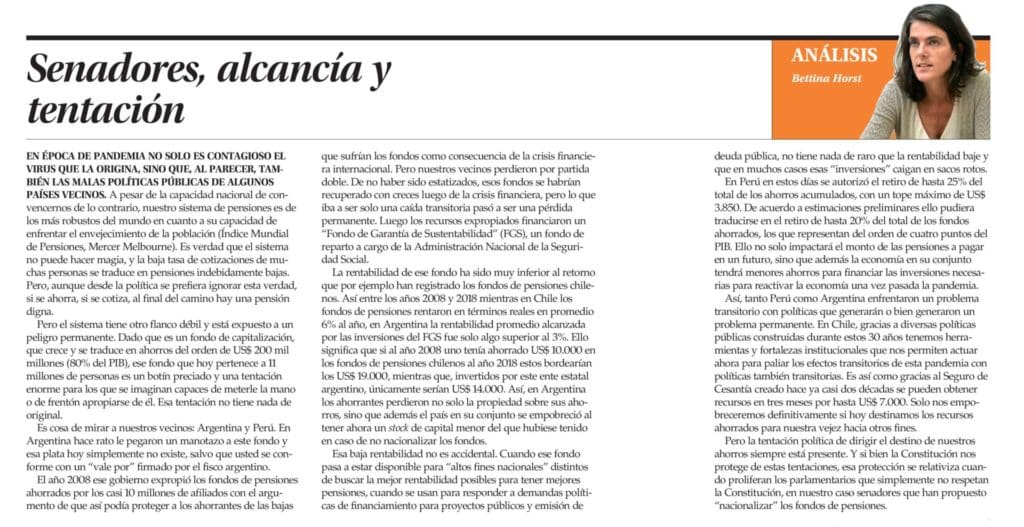 Pero la tentación política de dirigir el destino de nuestros ahorros siempre está presente. Y si bien la Constitución nos protege de estas tentaciones, esa protección se relativiza cuando proliferan los parlamentarios que simplemente no respetan la Constitución, en nuestro caso senadores que han propuesto “nacionalizar” los fondos de pensiones.
