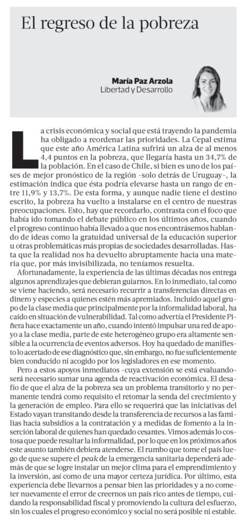 Pero a estos apoyos inmediatos -cuya extensión se está evaluando- será necesario sumar una agenda de reactivación económica. El desafío de que el alza de la pobreza sea un problema transitorio y no permanente tendrá como requisito el retomar la senda del crecimiento y la generación de empleo. Para ello se requerirá que las iniciativas del Estado vayan transitando desde la transferencia de recursos a las familias hacia subsidios a la contratación y a medidas de fomento a la inserción laboral de quienes han quedado cesantes. Vimos además lo costosa que puede resultar la informalidad, por lo que en los próximos años este asunto también debiera atenderse. El rumbo que tome el país luego de que se supere el peak de la emergencia sanitaria dependerá además de que se logre instalar un mejor clima para el emprendimiento y la inversión, así como de una mayor certeza jurídica. Por último, esta experiencia debe llevarnos a pensar bien las prioridades y a no cometer nuevamente el error de creernos un país rico antes de tiempo, cuidando la responsabilidad fiscal y promoviendo la cultura del esfuerzo, sin los cuales el progreso económico y social no será posible ni estable.