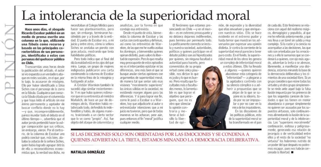 Desde mi punto de vista, bienvenidas la columna de Escobar y las cartas con contrapuntos y defensas, así como las entrevistas de Warnken, de las que me he vuelto asidua los domingos, y bienvenidos quienes opinan distinto pues valoro la libertad de expresión. Pero lo que resulta muy preocupante de estos episodios no es el intercambio epistolar ni las diferencias, sino más bien el que se busque anular ciertas opiniones con argumentos de superioridad moral, de manera tal que serían solo esas visiones “moralmente superiores” las únicas válidas en la sociedad, no existiendo margen alguno para las diferencias. Y si para lograr ese fin, como le pasó a Escobar o a Warnken, hay que adjudicarle al autor o entrevistador intenciones que a mi juicio no tuvieron, pero que de todas maneras se les achacan, peor aún pues entonces el fin “moral” justifica cualquier medio.