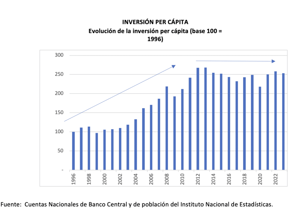 Pues bien, en la década de los noventa y hasta 2012 aproximadamente, la inversión per cápita se multiplica por 2,5 veces. Es decir, un trabajador en 2012 tiene 2,5 más veces más “maquinas e infraestructura” en su mano para producir bienes de lo que tenía en 1996. Sin embargo, a partir de 2013 esta variable se estancó y prácticamente se ha mantenido congelada durante la última década.