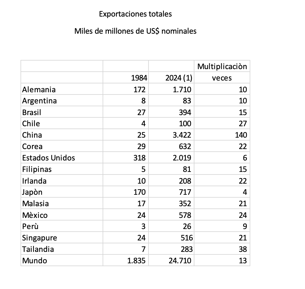 Ahora bien, multiplicar por 27 las exportaciones tras 4 décadas parecen ser poco frecuente y la tabla anexa da cuenta de los resultados observados. En efecto, las exportaciones mundiales han aumentado en 13 veces en el tiempo analizado, lo que implica una varianza significativa entre países, y es así como vemos a Japón con un coeficiente de expansión de 4 veces, pero situado en un punto de referencia de una década, donde los productos japoneses ya inundaban al planeta y Reagan enfrentaba la invasión de autos nipones en norte América y si bien en los setenta un producto japones era barato, desechable y de baquelita, eso cambio rápidamente y se convirtió en el símbolo de la frontera tecnológica. Lamentablemente, Japón ha perdido parte de ese impulso competitivo y ve con temor el incremento del poderío de China.