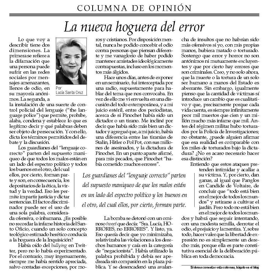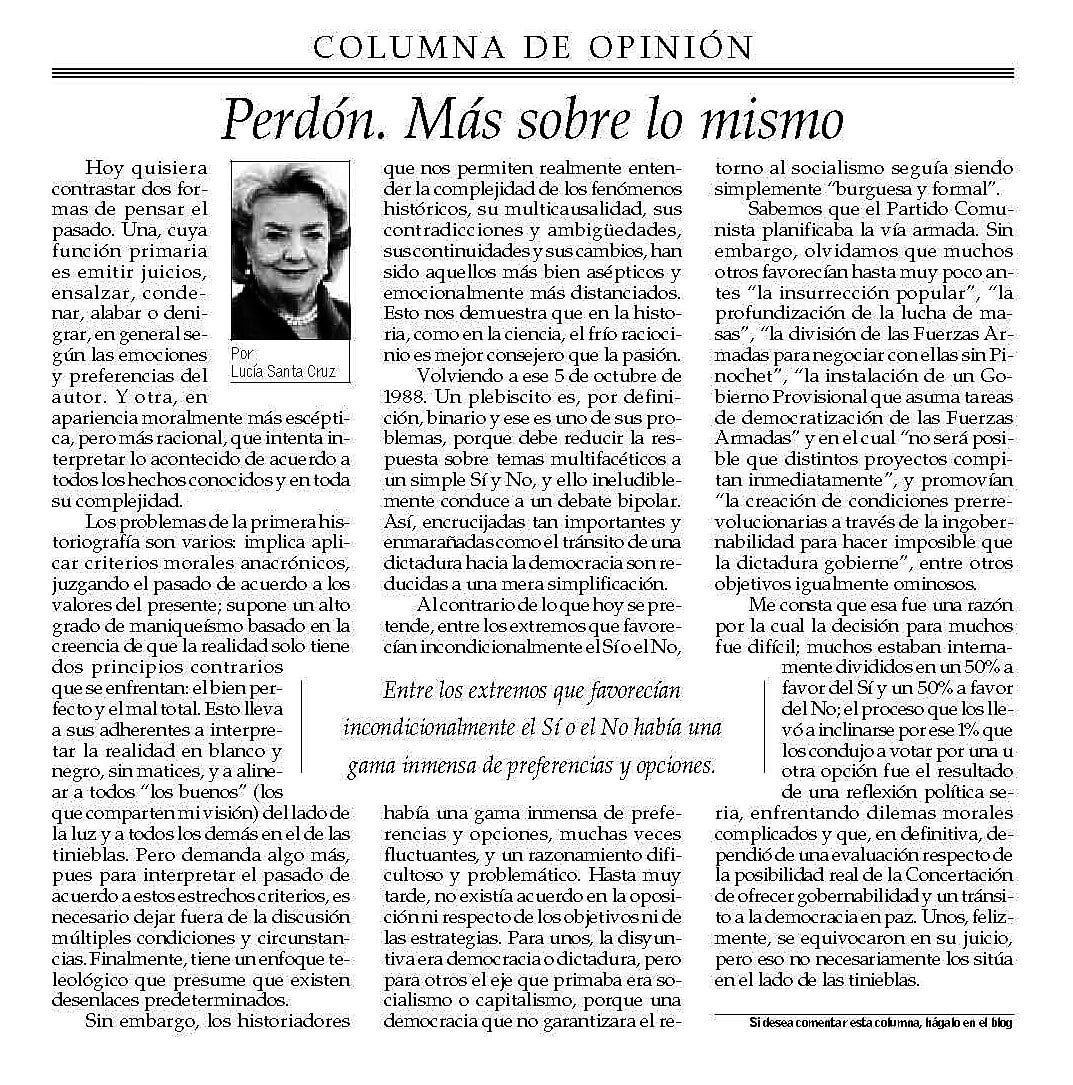 Columna de Lucía Santa Cruz en El Mercurio: «Perdón. Más sobre lo mismo»