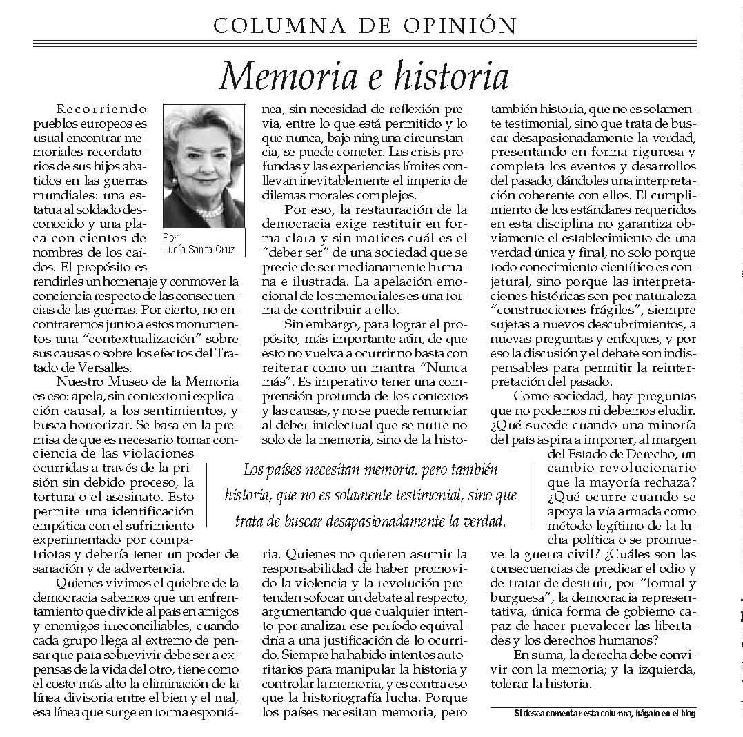 Columna de Lucía Santa Cruz en El Mercurio: «Memoria e historia»